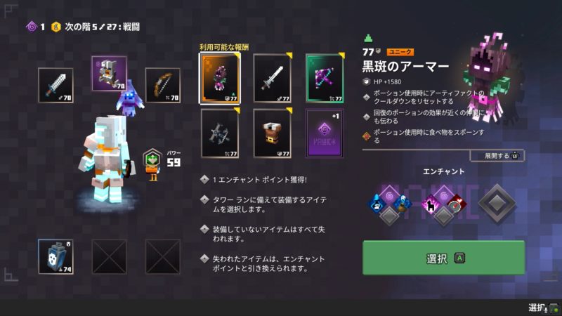 ポーションに関わる効果が多く面白いタイプのアーマーが実装されましたね。高難易度のタワーにおいてポーション使用時に追加で食べ物をスポーンしてくれるのが嬉しいです。